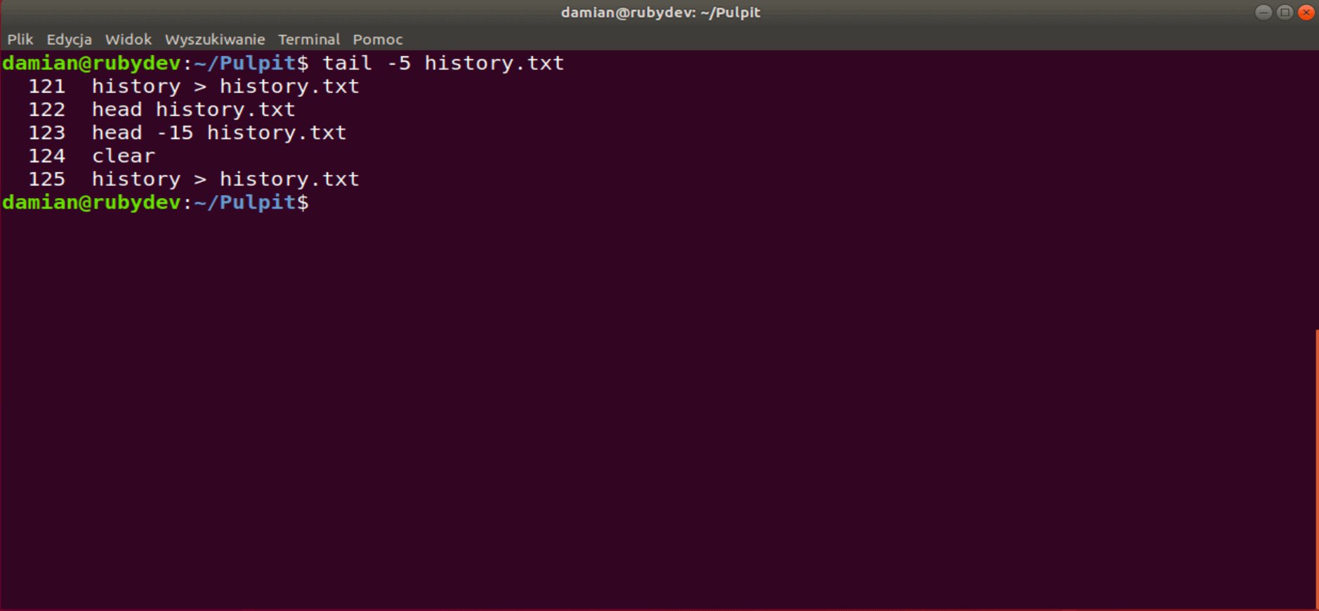 We will need a text file. Let’s use the already mentioned history command and the redirection > character.