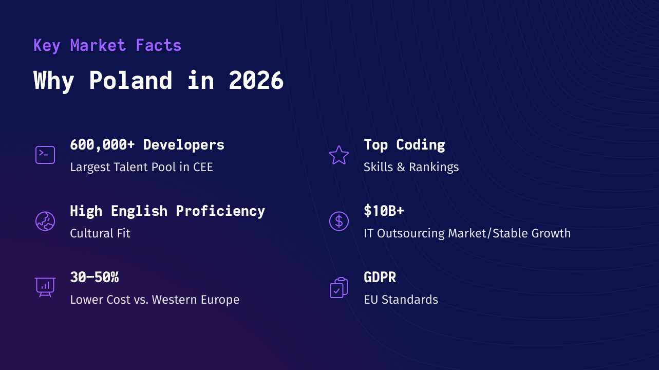Poland continues to strengthen its position as one of Europe’s most strategic nearshore destinations. By 2026, Poland’s IT services and software outsourcing market exceeds $10 billion annually, supported by a talent pool of more than 600,000 Programvaruutvecklare. This makes Poland the largest tech hub in Central and Eastern Europe.